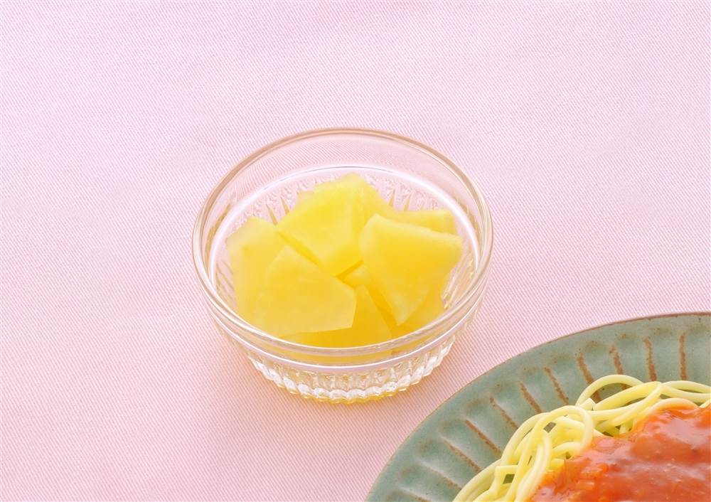 - ①りんごは皮をむいて食べやすい大きさに切る。