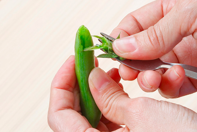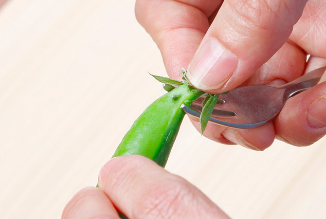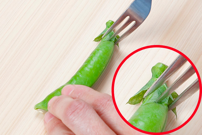 親指 と人差 し指 でヘタとフォークをつかんだまま、筋 を引 っ張 る。
