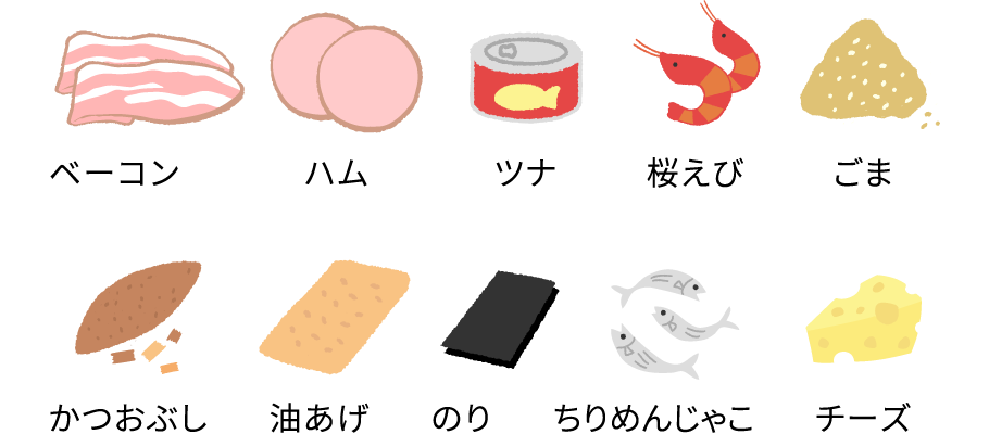 野菜を炒めるときは、ベーコンやツナ、桜えび、ちりめんじゃこ、油あげなどを加えると、