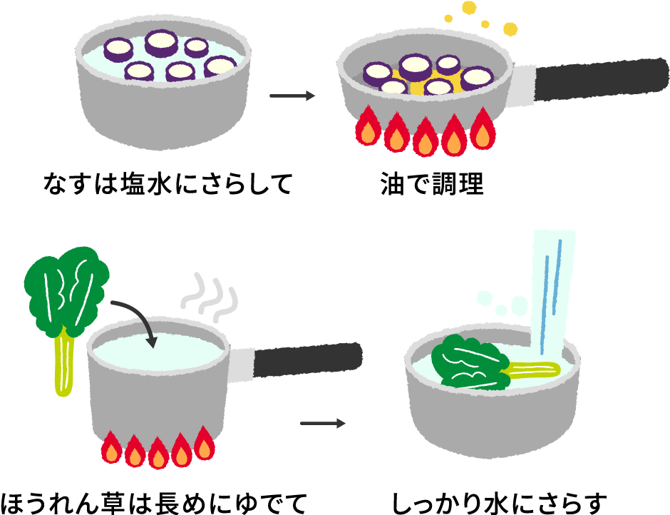 なすやごぼう、れんこんなどのアクの強い野菜はアクぬきをすると食べやすくなります。