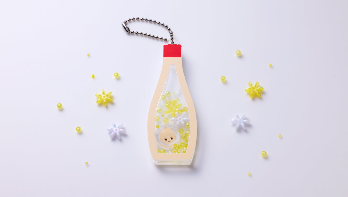 マヨネーズ型アクリルケースにキラキラビーズをいれてオリジナルキーホルダーが作れます。