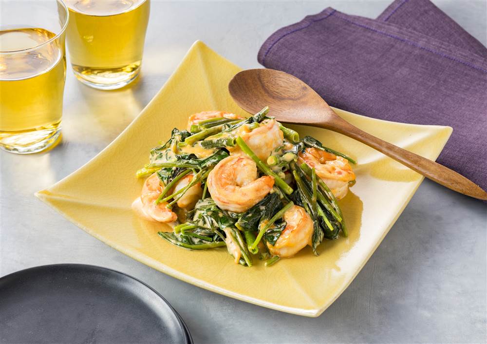 タイ料理の「パックブンファイデーン」は、空芯菜をニンニクや唐辛子と一緒にさっと炒めた料理です。シラチャーマヨを使って、えびを加えて仕上げました。