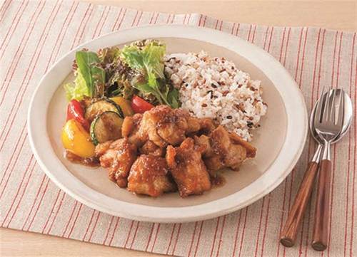 穀類、野菜、肉をバランスよく一皿に。キユーピー 黒酢たまねぎドレッシングをたっぷりと全体にかけた、ヘルシー感のあるワンプレートメニューです。