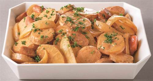 春ならではの新じゃがいもをスパイシーなキユーピー コブサラダドレッシングでマリネに。さっぱりでも食べ応え十分な「ジャーマンポテト風」の仕上がり。
