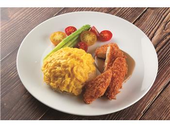器に[2]を150g盛り、そのわきに中濃ソースとマヨネーズを混ぜ合わせたソースを敷き、鯛フライを置く。[3]を盛り、盛り付けたバターライスの上に丸形にしたケーキ用のフィルムをのせ、その中にあたためたスノーマン とろっとたまご(洋食店の味)を流し入れる。