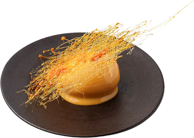 「マヨネーズのもったりしたテクスチャーは、食材全体に味や色を行き渡らせ、留めるのに便利」(飯山氏)。イカスミソースを多めにつくり、そこに揚げたエビを沈めることでソースを隅々までコーティングした。乳化しているため水っぽいソースよりも分離しにくい。