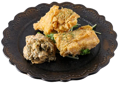 ササミはなんでも合うからこそソースが重要度です。タルタルソースのピクルスの代わりに梅干しを使用した夏向けのソースで、梅干しの酸味にドライトマトの酸味を合わせ、旨みも加えました。意外な組合せもマヨネーズがあればいい具合にまとまります。