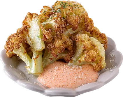 下味なしで素揚げしたカリフラワーは、ソース次第でどんな味にも仕上げられます。定番の明太マヨソースはプチプチとした食感ときれいなピンク色に着目し、そこに味噌を加えてコクと深みを足しました。少量のハチミツ、醤油で甘み塩みを調整しています。