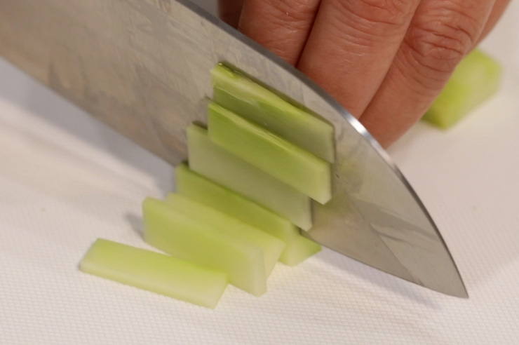 茎は皮を厚めにむき、5mm程度の厚さの短冊切りにする。