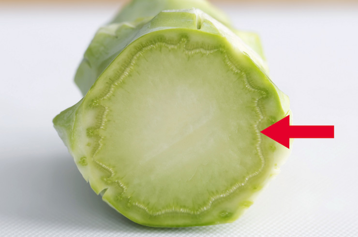 茎の皮は、切り口の白い線より外側の硬い部分です。花蕾が動きやすいので、しっかり手をそえて包丁で切り落としましょう。