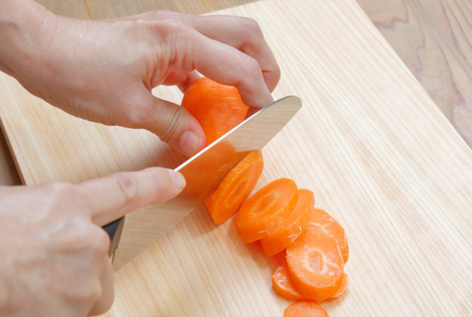野菜を薄切りやななめ薄切りにしたものを、3~4枚重ね、端から切る方法です。