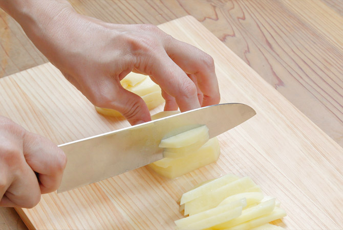 切ったものをいくつか重ねて3〜5mm程度の幅で切っていく