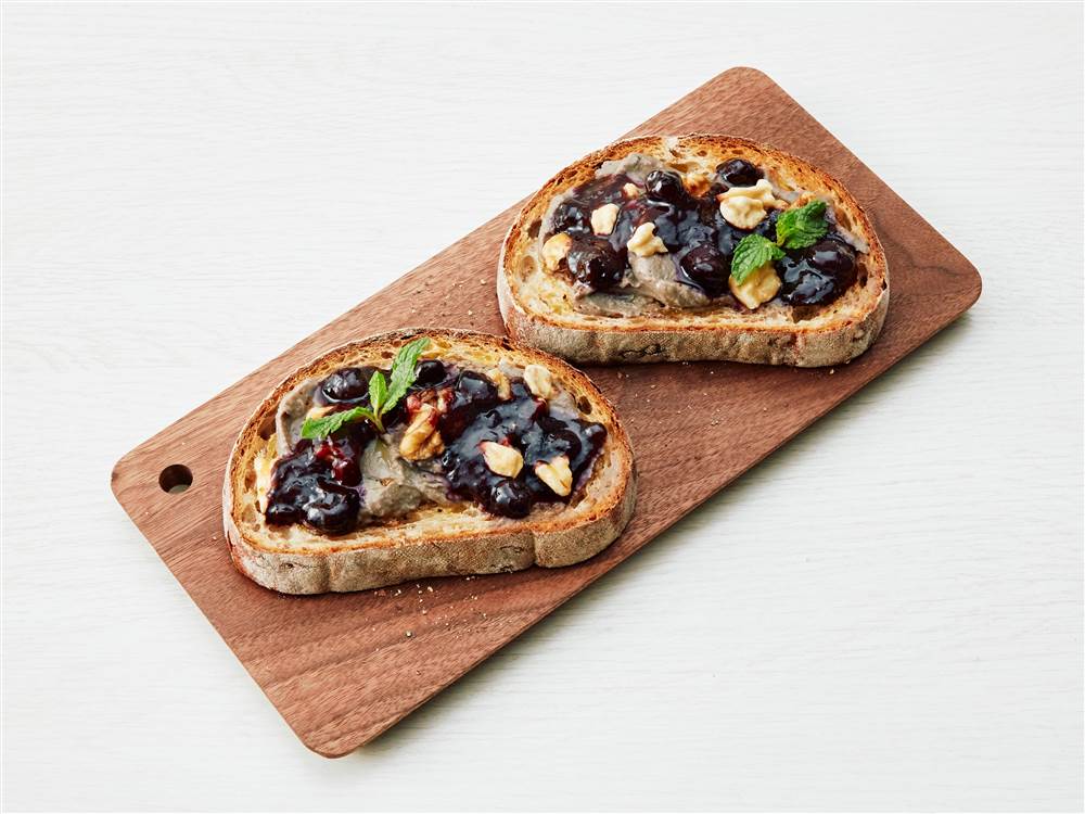 3②の片面に①をぬり、残りのまるごと果実と砕いたくるみをのせ、黒こしょうをふり、オリーブ油を全体に回しかけ、ミントを飾る。