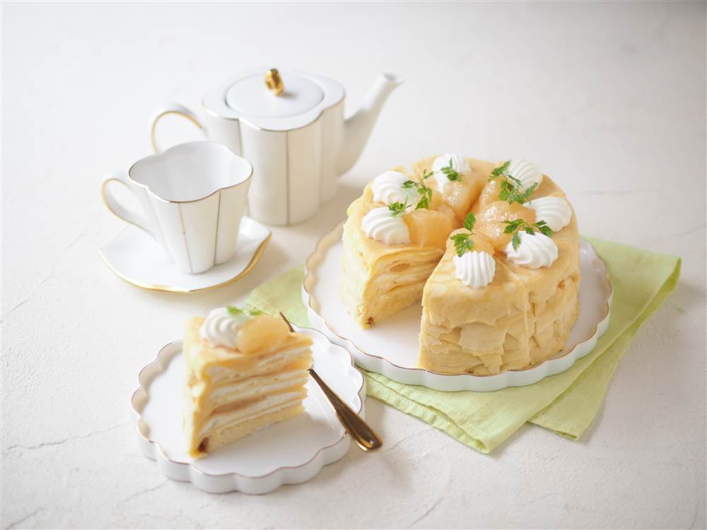 クレープ生地にバニラアイスを使うことで、クリーミーな仕上がりになり、まるごと果実 白桃の果実感とよく合います。