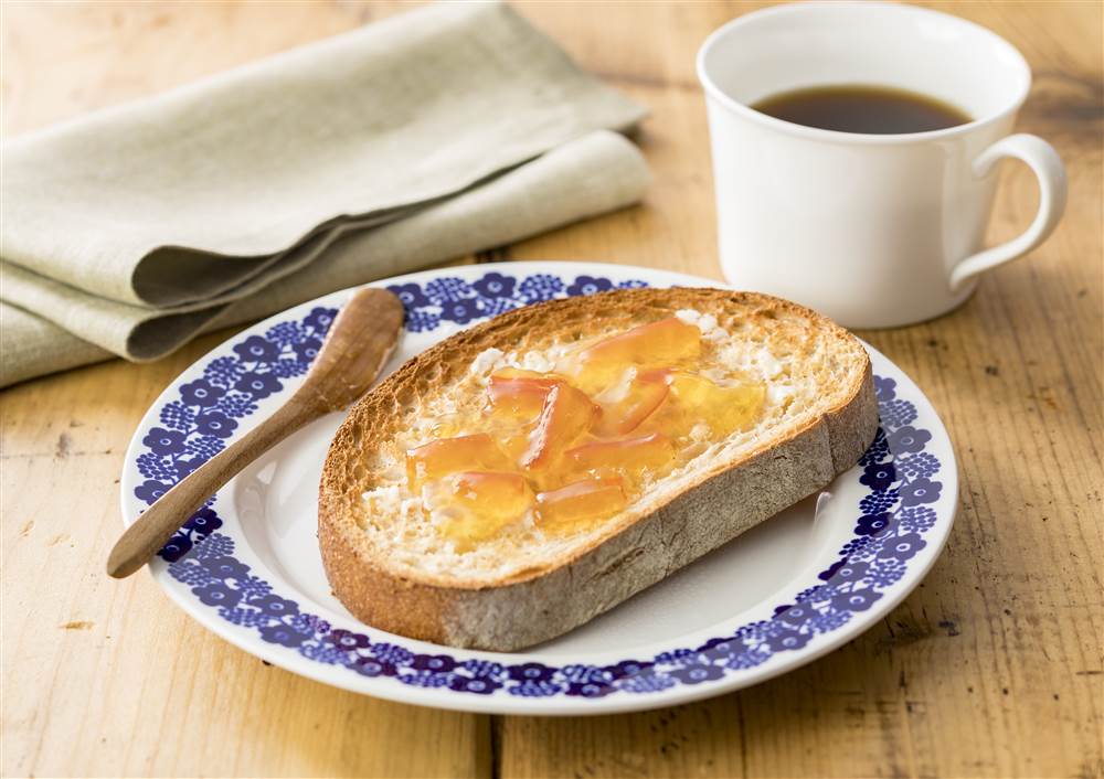 こんがりと焼いた香ばしいカンパーニュに、バターの塩味とトラディショナル ビターママレードのほろ苦い甘さがよく合います。