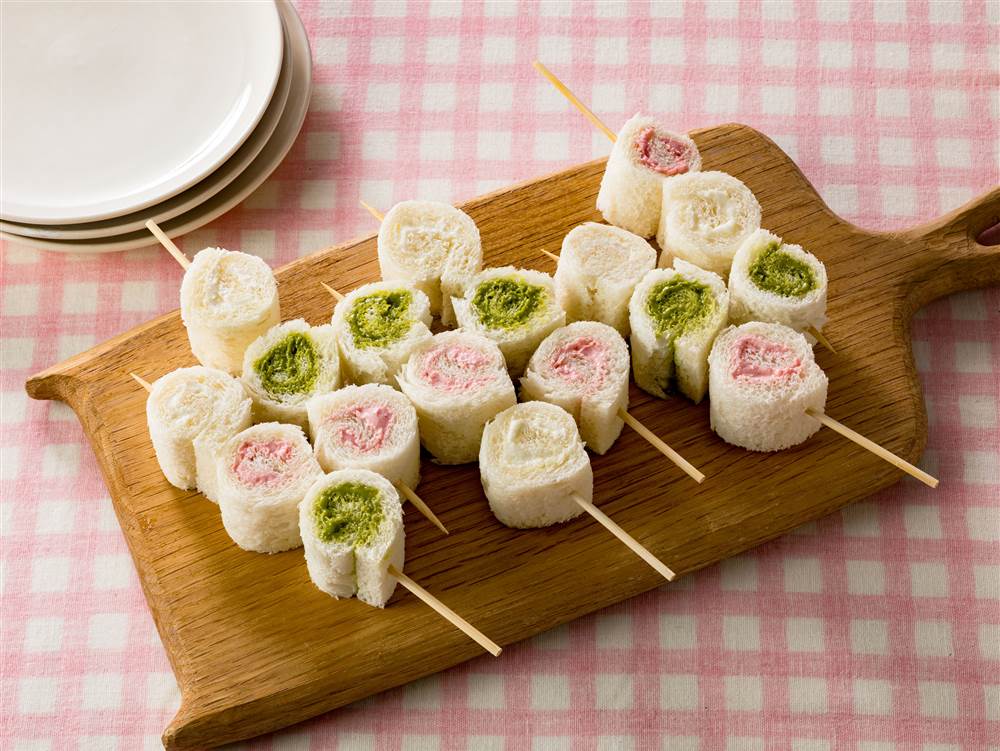3種のミルキーホイップを巻いて食べやすい大きさに切ったロールサンドイッチです。三色のお団子をイメージし、見た目もたのしく仕上げました。