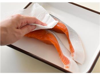 1鮭は振り塩をし、水滴がうき出てきたら、よくふきとる。