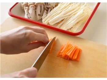 2ぶなしめじとえのきだけは石づきを取り、小房に分ける。にんじんはせん切りにする。
