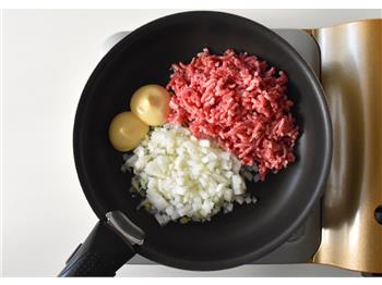 3フライパンに①、合いびき肉、水、マヨネーズを入れてよく混ぜ合わせてから火をつけて炒める。