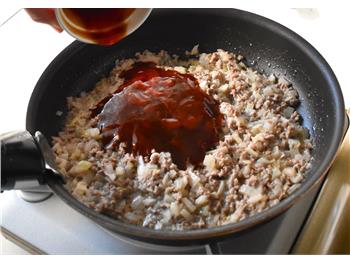 4③を火にかけて炒め、火が通って合いびき肉が細かくほぐれたら②を入れる。