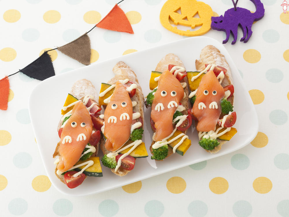 マヨネーズでおばけの手と目を描き、黒目に丸く切ったのりをのせる。