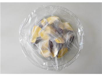 ぬれたままクッキングペーパーで包んで耐熱器にのせ、ラップをかけ、レンジ(600W)で約3分30秒加熱する。