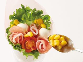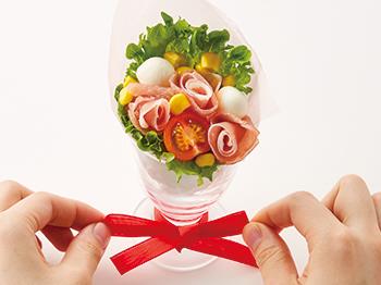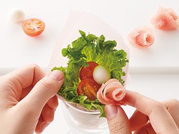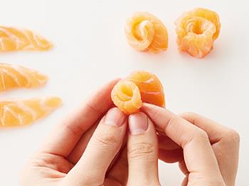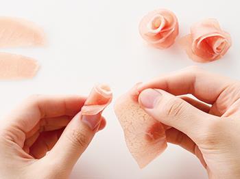 3生ハムは1枚を長さ半分に切り、端から巻き、さらにそのまわりにもう1枚ふんわりと巻き、花の形を6個作る。