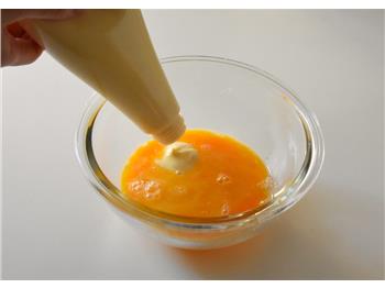 1ボウルに卵を溶き、マヨネーズ大さじ1を加えて混ぜる。