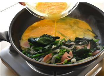 5フライパンの端に④をよせ、空いたところに①を加えて半熟状にし、全体を混ぜ合わせる。