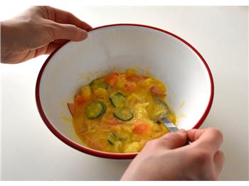 1ボウルに卵を溶き、ポテトサラダを入れて、もったりするまで混ぜ合わせる。