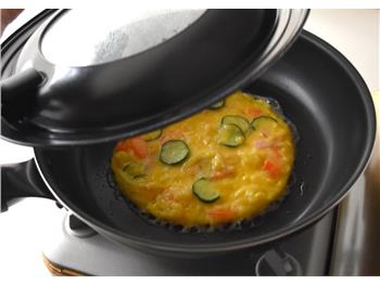 2フライパンに油をひいて熱し、①を流し入れ、ふたをして弱火で両面焼く。
