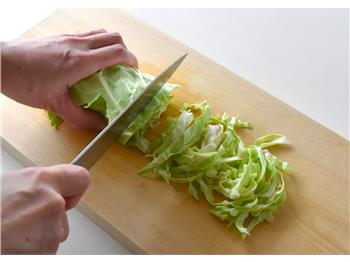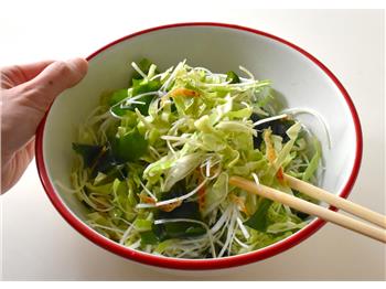 1春キャベツは細切りにする。長ねぎは白髪ねぎにし、水にさらして水気をきる。わかめは食べやすい大きさに切る。