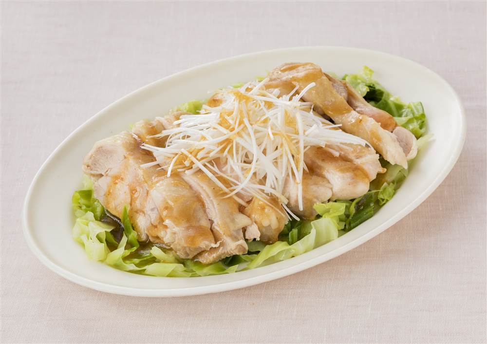 4器に③の水気をきったキャベツ、食べやすい大きさに切った鶏もも肉、②の順にのせ、ドレッシングをかける。