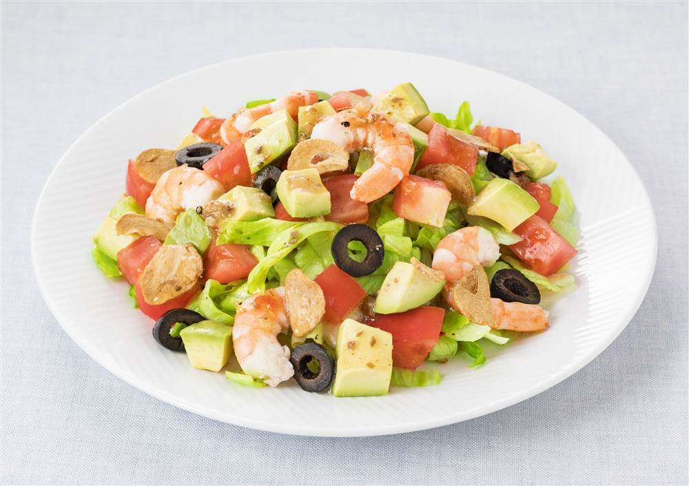 4器に①~③を盛りつけ、ブラックオリーブとフライドガーリックを散らし、ドレッシングをかける。