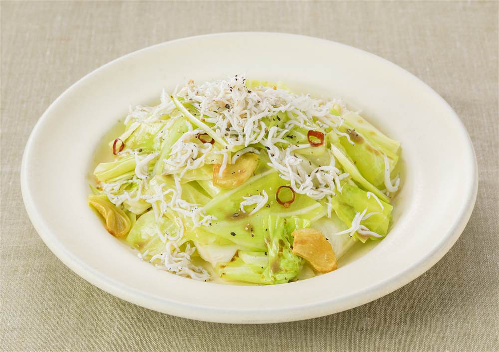 キャベツとにんにくに、アンチョビーのうまみと塩気がよく合います。たっぷりのしらす干しがよく合う一品です。