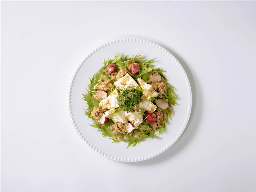 まろやかな豆腐に濃厚なごまドレッシングがよく合います。青じその香りがアクセントの、見た目も食感もたのしめるサラダです。