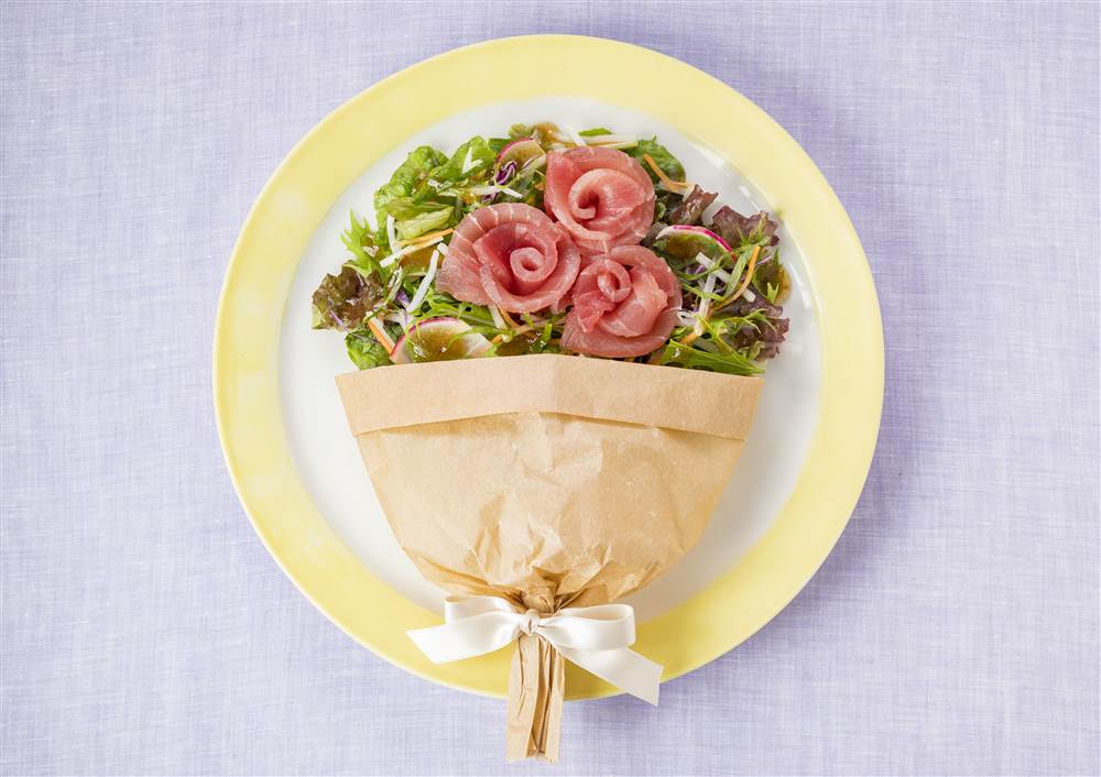 パッケージサラダでかんたんに作れるブーケサラダです。まぐろの刺身に、玉ねぎのフレッシュな香りと炒めた玉ねぎの甘みをいかした和風ドレッシングがよく合います。青じその風味がアクセントです。