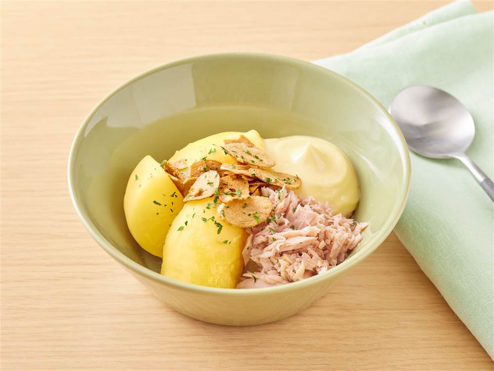 テーブルでじゃがいもと具材を合わせながら、お好みの具材感に仕上げてたのしめるポテトサラダです。ツナとガーリックの風味が食欲をそそる一品です。