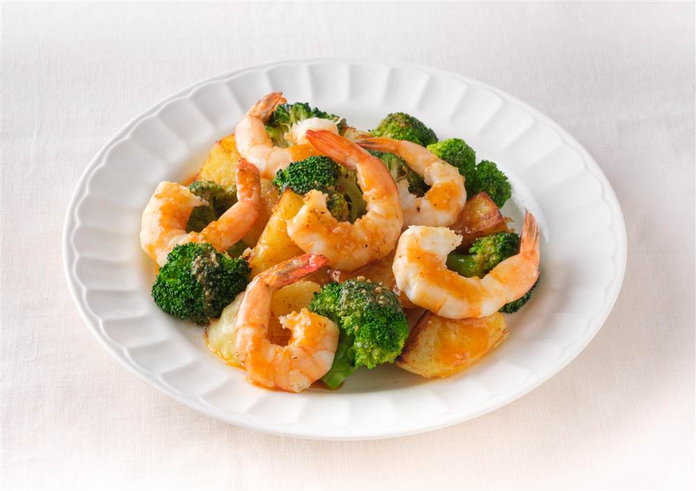 こんがりと焼いたじゃがいもとえびに、トマトの風味にガーリックやアンチョビーのうま味をきかせ、味わい深く仕上げたドレッシングがよく合います。