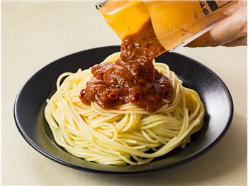 パスタソースで和えるだけでかんたんに作れます。トマトのフレッシュ感とピリッとした辛さがたのしめるパスタです。