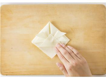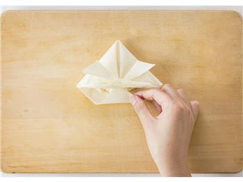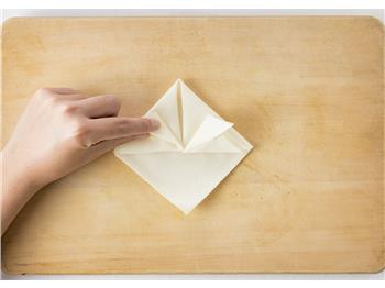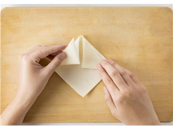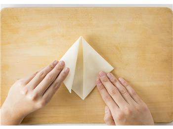 4③で折った両端の三角形を下から上に半分に折り上げ、①をつけてくっつける。