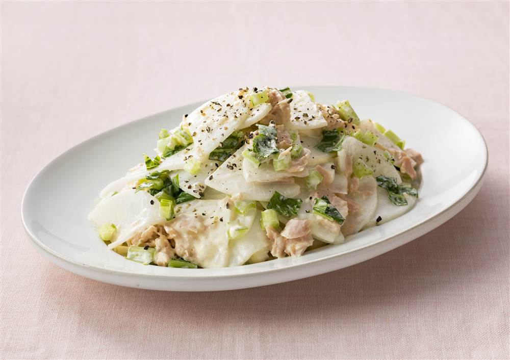 薄くスライスした大根のシャキシャキとした歯ごたえがやみつきになるサラダです。キユーピーハーフとを使うことで、独自のマイクロエマルション製法によるマヨネーズらしいとろみが野菜の水分を包み込み、水っぽくなりにくく、みずみずしいおいしさがたのしめる一品です。