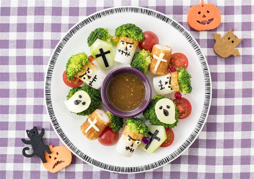 ちくわにブロッコリーをさしてフランケンシュタインにした、ハロウィンにぴったりのサラダです。ごま油の香りに炒めたにんにくのうま味を合わせ、コク深く仕上げたドレッシングがよく合います。