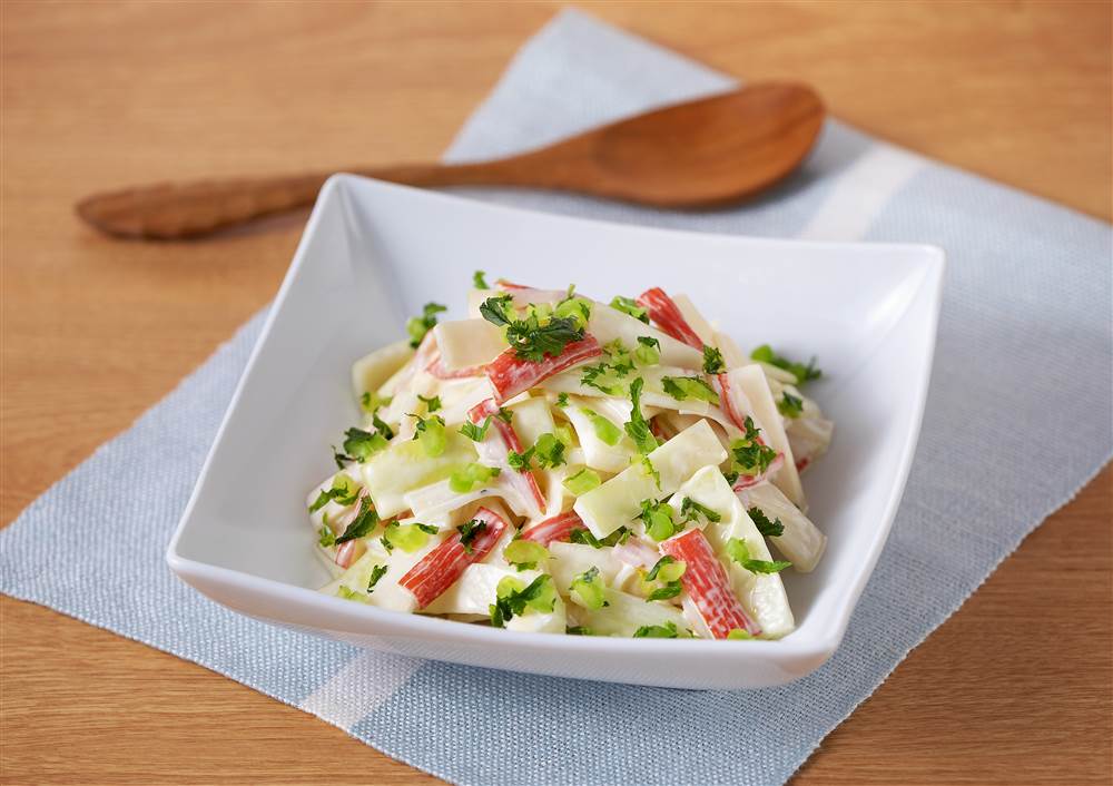 2かに風味かまぼこは長さを半分に切り、ほぐす。