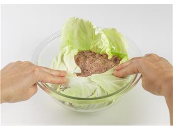 3耐熱ボウルに、①のキャベツの半量を敷き、②を詰め、残りのキャベツをのせる。ふんわりとラップをかけ、レンジ(600W)で約12分加熱する。