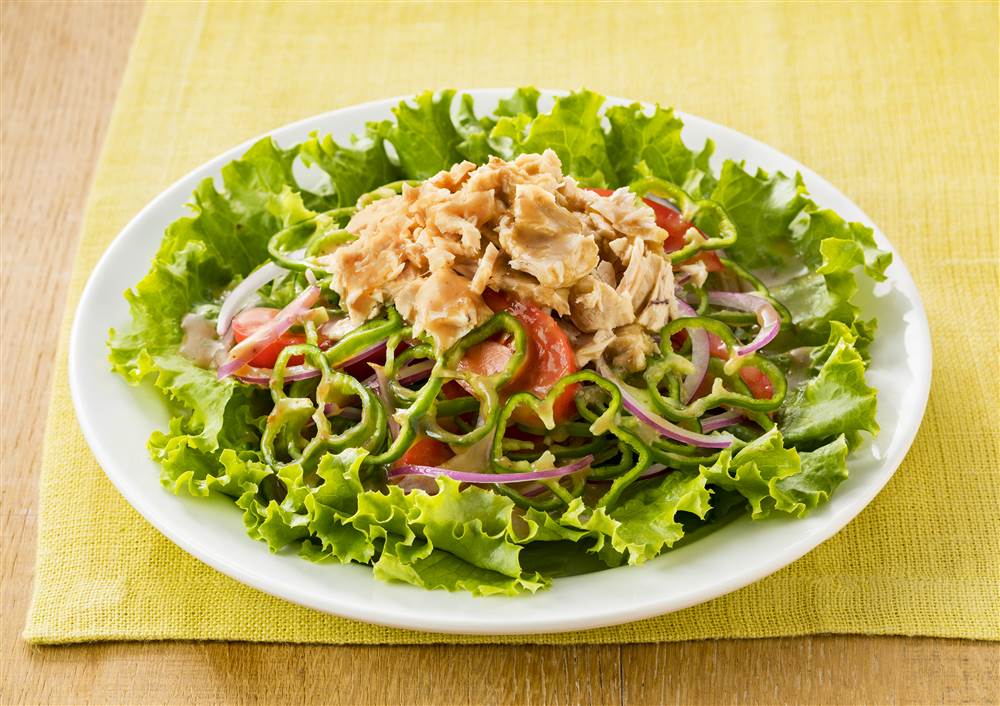 生のピーマンのフレッシュな食感と風味に、すりおろした玉ねぎと炒めたにんにくで、味わい深く仕上げたドレッシングがよく合います。