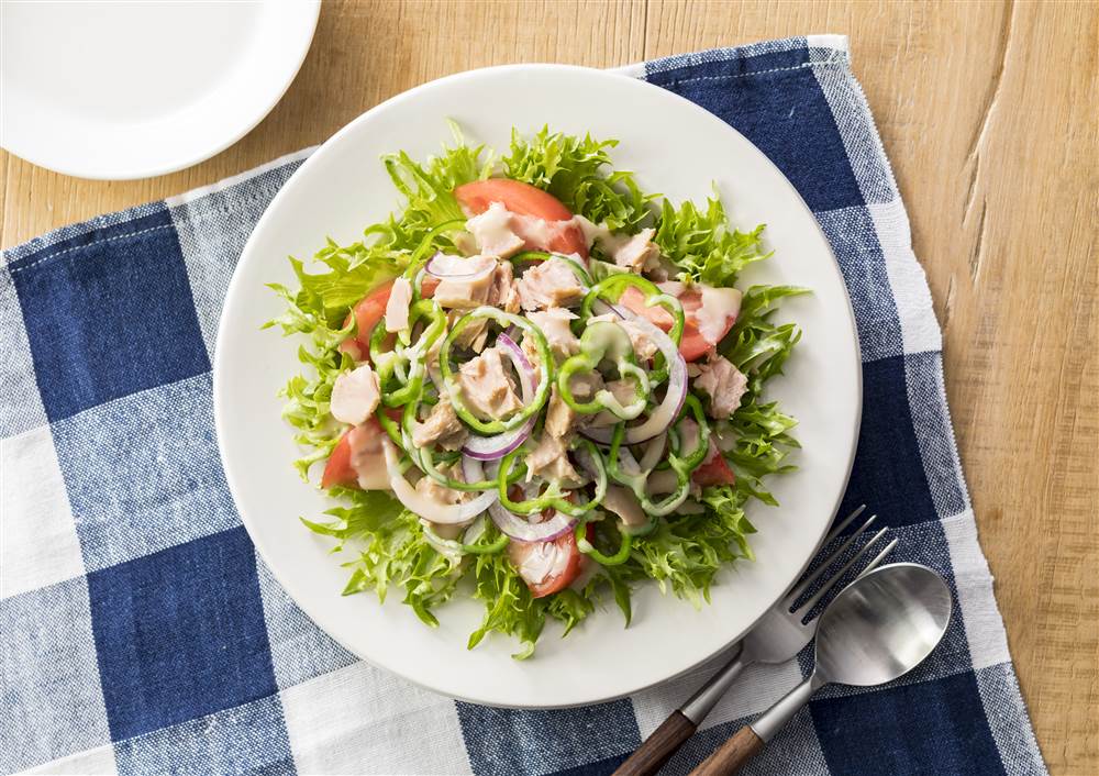 3器に①を敷き、②と汁気をきったツナを盛りつけ、ドレッシングをかける。