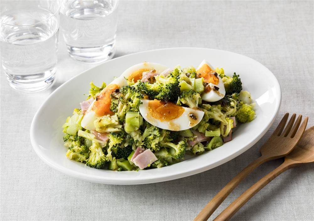 やわらかいブロッコリーのつぼみと、歯ごたえのあるブロッコリーの茎に、炒めた玉ねぎの風味とたまり醤油で味わい深く仕上げたドレッシングがよくからむサラダです。ゆで卵とベーコンが彩りを華やかにし、味のアクセントにもなります。
