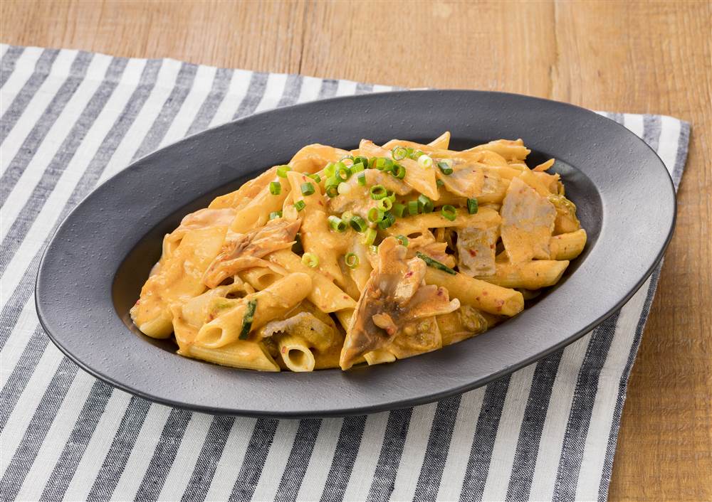 フライパンひとつでできる、ワンパンパスタです。かつおと醤油をベースに、炒めた玉ねぎでコクを加えたオイルソースを使い、キムチの酸味と辛みに、生クリームでコクを加えました。
