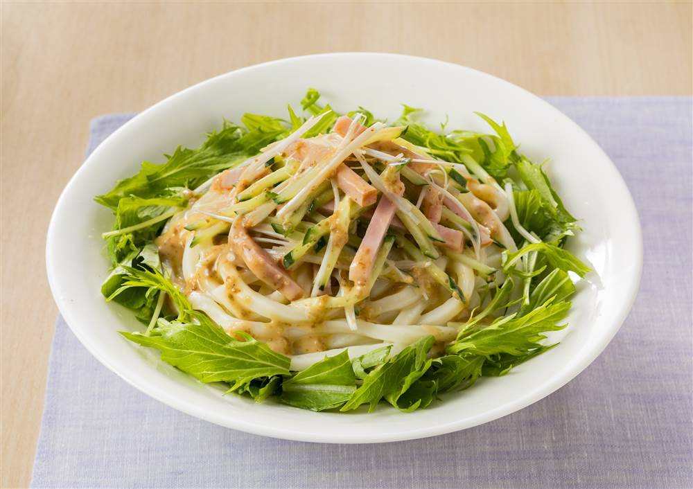 シャキシャキした食感のきゅうりと水菜、白髪ねぎの風味、ロースハムのうまみを合わせたサラダうどんです。薬味や柑橘の味わいを加えさっぱりと仕上げた深煎りごまドレッシングでさっぱりと召しあがれます。